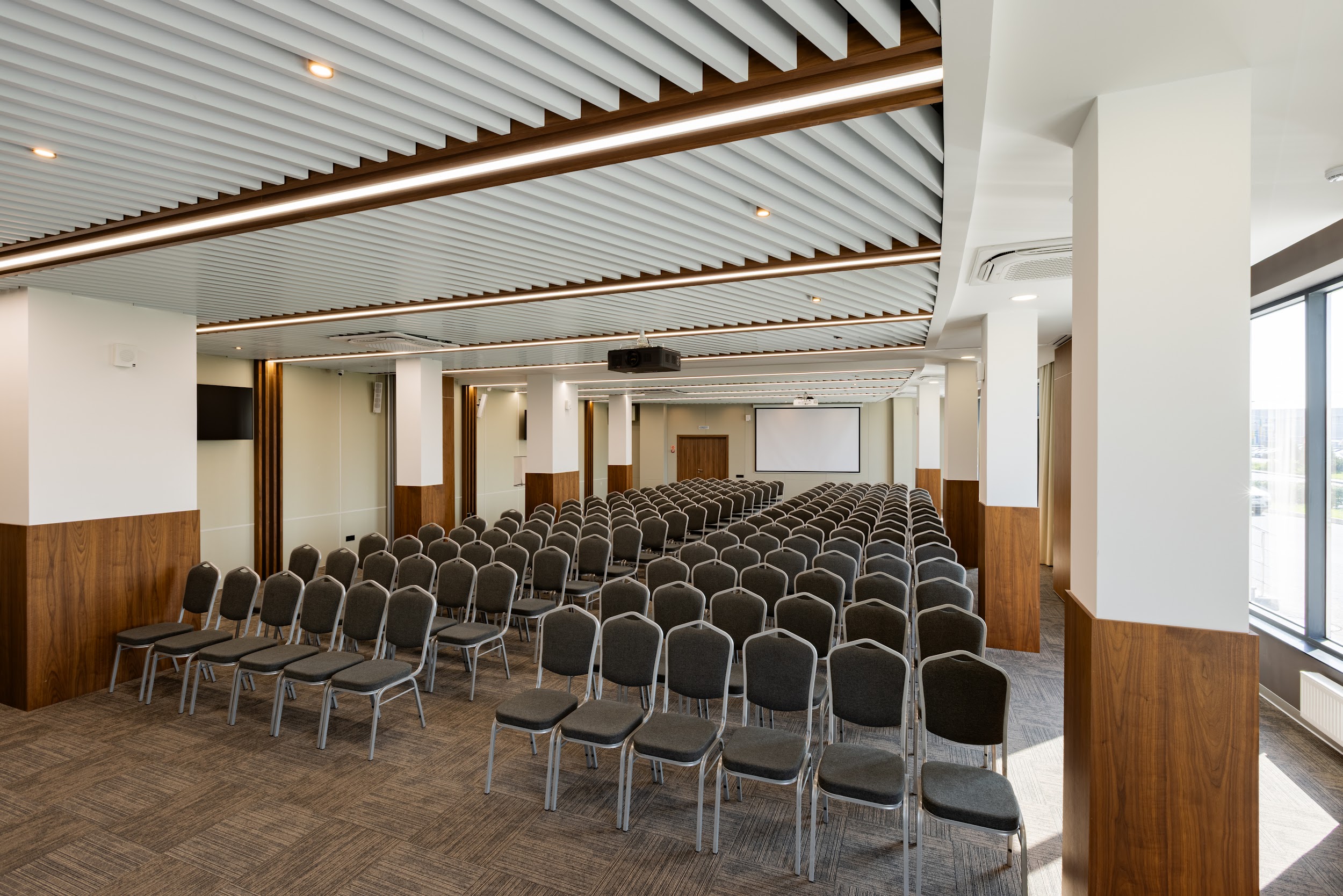 Многофункциональный зал-трансформер 202 кв.м, легко адаптируемый под любые форматы мероприятия, с несколькими вариантами расстановки мебели.